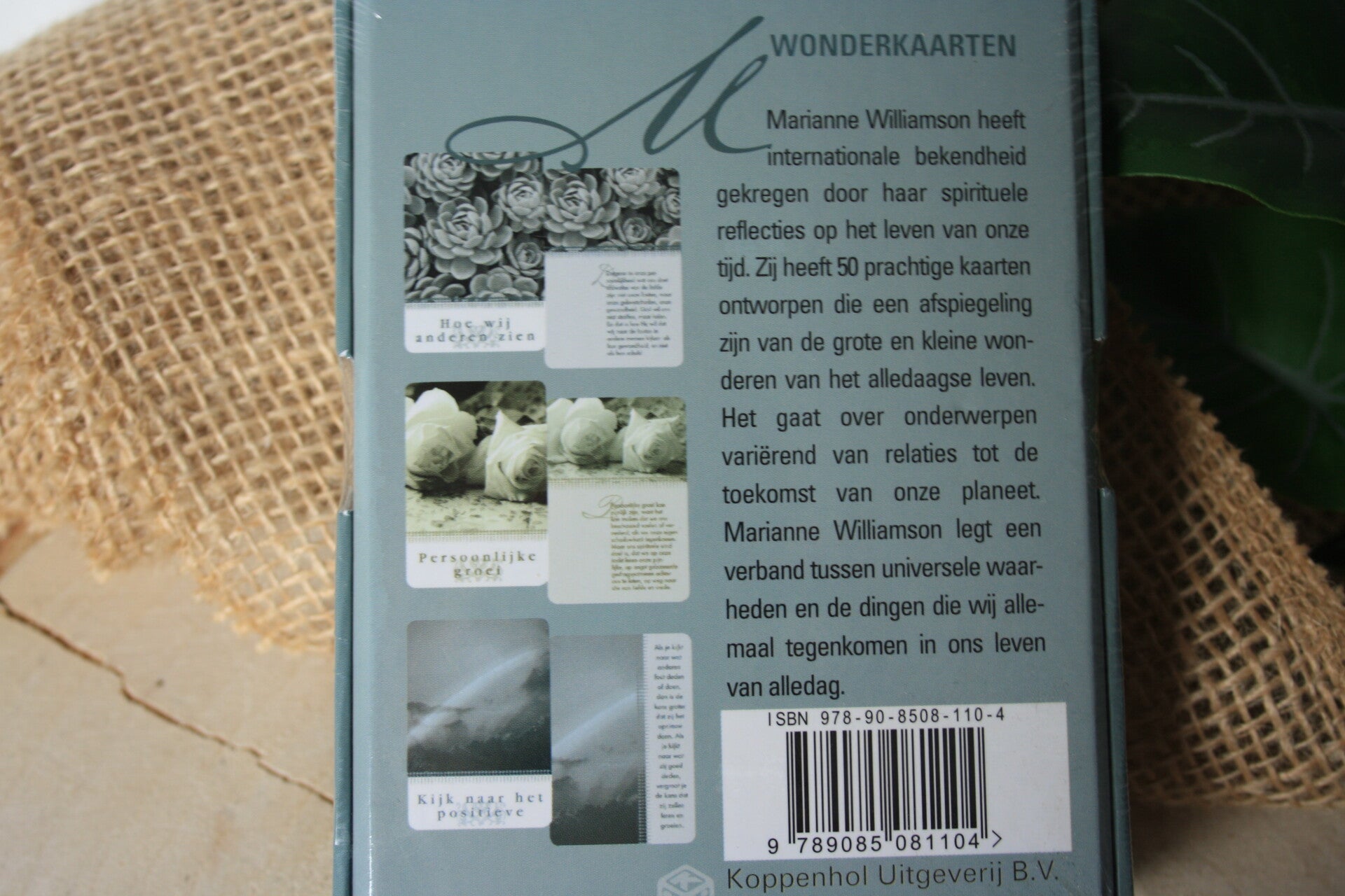 De Wonderkaarten van Marianne Williamson bieden 50 kaarten die een afspiegeling zijn van de grote en kleine wonderen van het alledaagse leven. Met thema’s variërend van relaties tot de toekomst van onze planeet, biedt deze set een diepgaande en inspirerende kijk op de universele waarheden die ons dagelijks leven beïnvloeden. Door middel van krachtige citaten en prachtige afbeeldingen helpt Marianne Williamson ons de wonderen in ons dagelijks bestaan te herkennen en te omarmen.