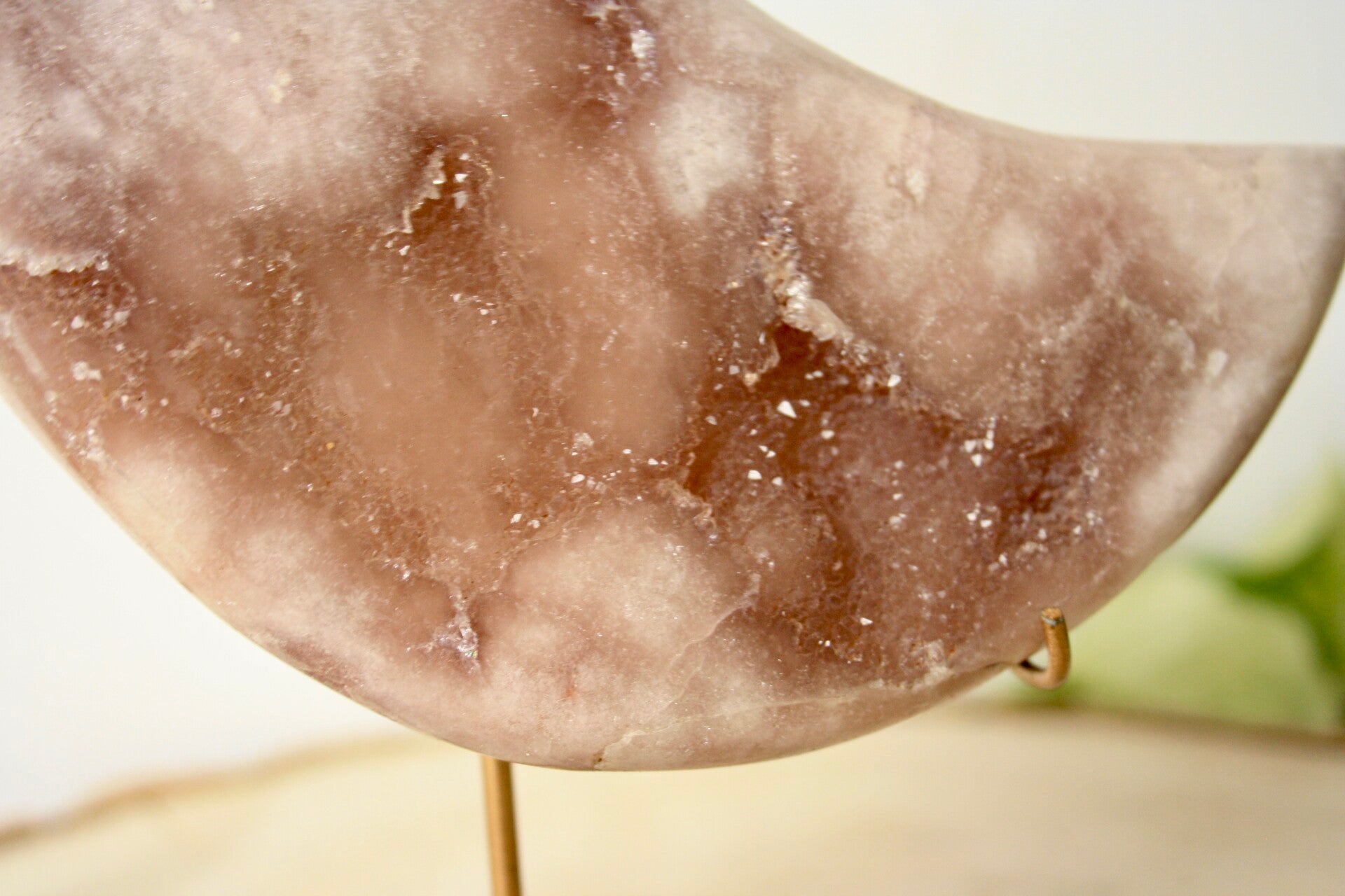 Deze unieke Roze Amethist Maan op Standaard is een verfijnd en krachtig kunstwerk dat rust en harmonie uitstraalt. Met haar zachte, roze tinten en elegante vorm brengt deze maan een kalmerende energie in elke ruimte. Perfect voor gebruik in meditatie, als decoratie, of om je spirituele praktijk te ondersteunen.