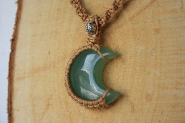 Deze bijzondere hanger is met de hand geknoopt in stevig bruin waxkoord en voorzien van een prachtige groene aventurijn in de vorm van een maan.